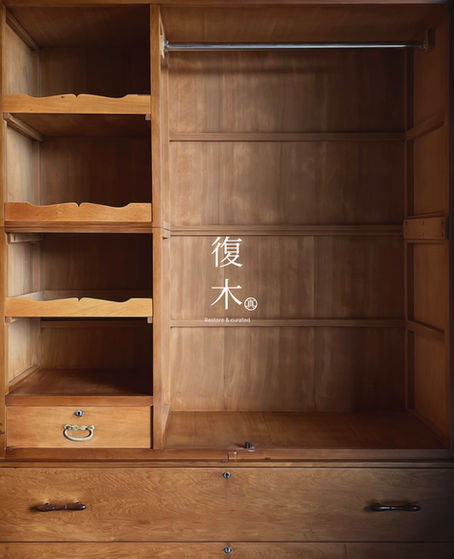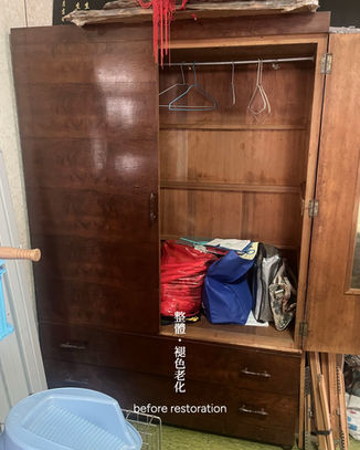這座雙門衣櫥選用台灣檜木打造,是委託人媽媽留存的珍貴嫁妝,安放在台南家中已逾半世紀。到場時,漆層老舊褪色、內部受潮變色,結構現明顯鬆脫現象。師傅先將衣櫥細緻拆解,手工砂磨去漆並清除陳年污垢,接著填補木縫與蟲孔,替換新的吊衣架,最後塗覆天然木漆,重現檜木溫潤光澤。修復後的衣櫥不僅結構穩固,更恢復了細膩木紋與自然香氣,讓承載家族記憶的嫁妝重獲新生。