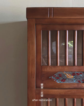 這是一件來自台南下營,有著百年歷史的墨畫菜櫥,使用台灣檜木製成,陪伴四代人走過生活的點滴。當時送來時,木體已嚴重風化、受潮脫膠,底板龜裂、抽屜腐蝕,部分區塊甚至難以開合。幾處墨畫仍隱約可見,但因表層劣化嚴重,無法全數保留。在與委託人多次討論後,我們決定盡可能維持原作精神,但仍需取捨部分無法修復的細節。最終以天然漆上保護,保留可見的畫作與木紋,讓這件家具不只是懷舊,也能再次走入日常生活,繼續承載家的記憶。
